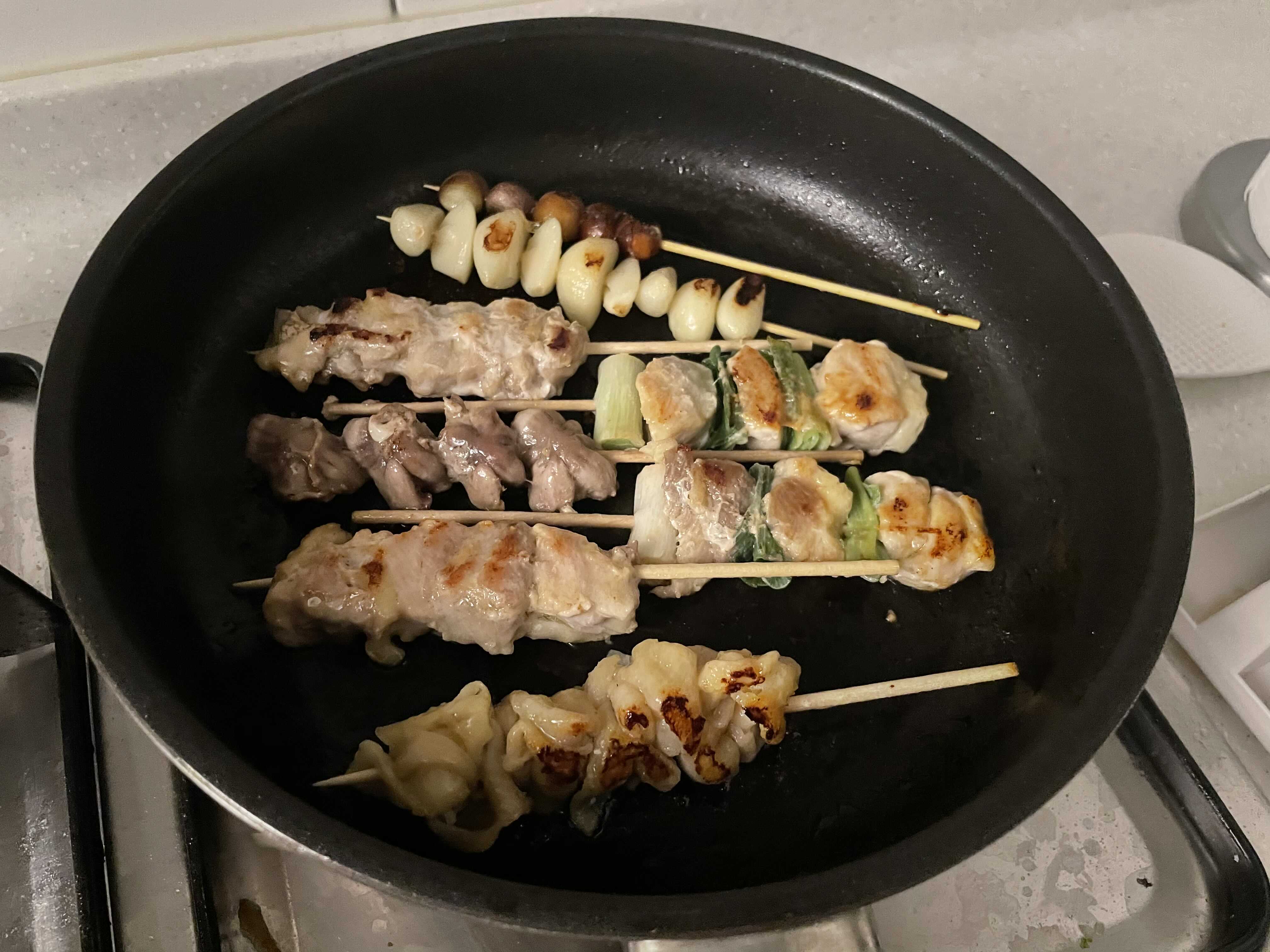 꼬치가 있기 때문에 꼬치가 다 들어가는 프라이팬을 사용하시는 게 정신건강에 좋습니다.