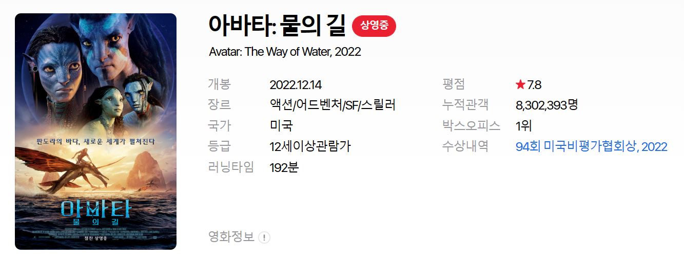 <아바타 : 물의 길> 영화의 정보와 리뷰에 대해 작성해 보았습니다.