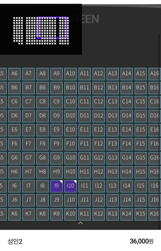 저의 경우 I열 9번, 10번을 예매하여 관람하였습니다.