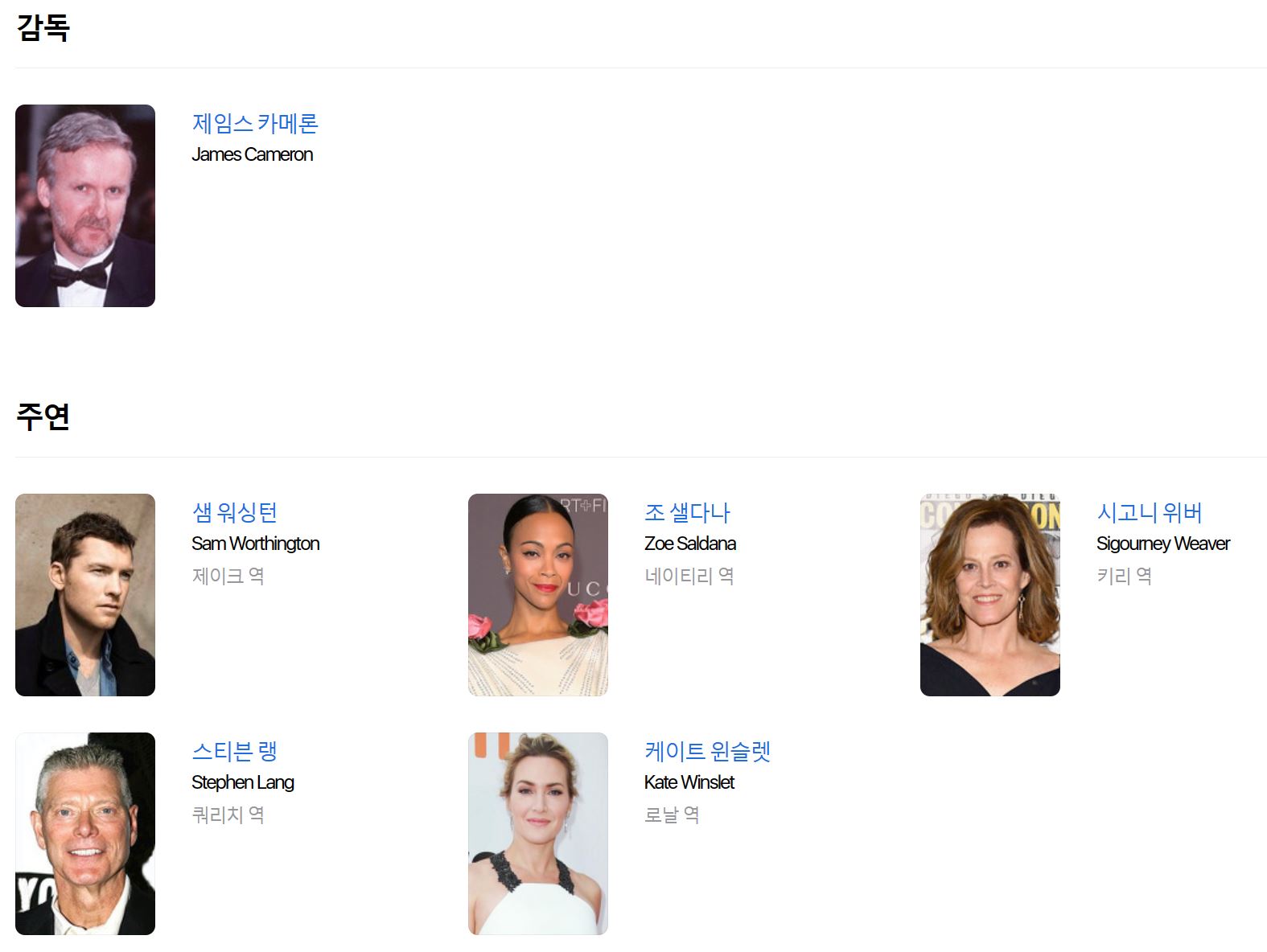 - 주연 : 샘 워싱턴, 조 샐다나, 시고니 위버, 스티븐 랭, 케이트 윈슬렛