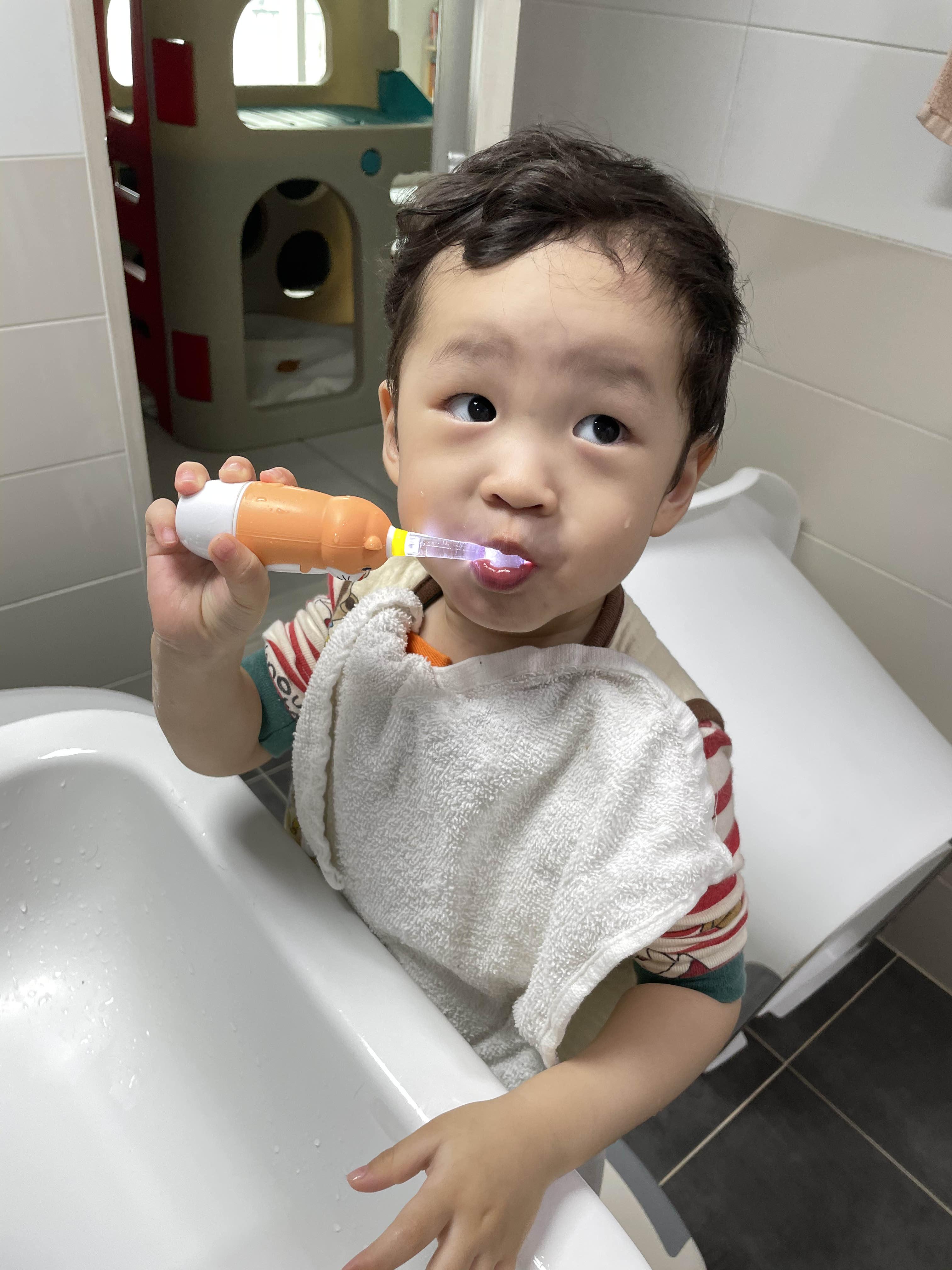 오늘 아이가 낮잠 자기 전 양치할 때 턱밑에 대어주었습니다.