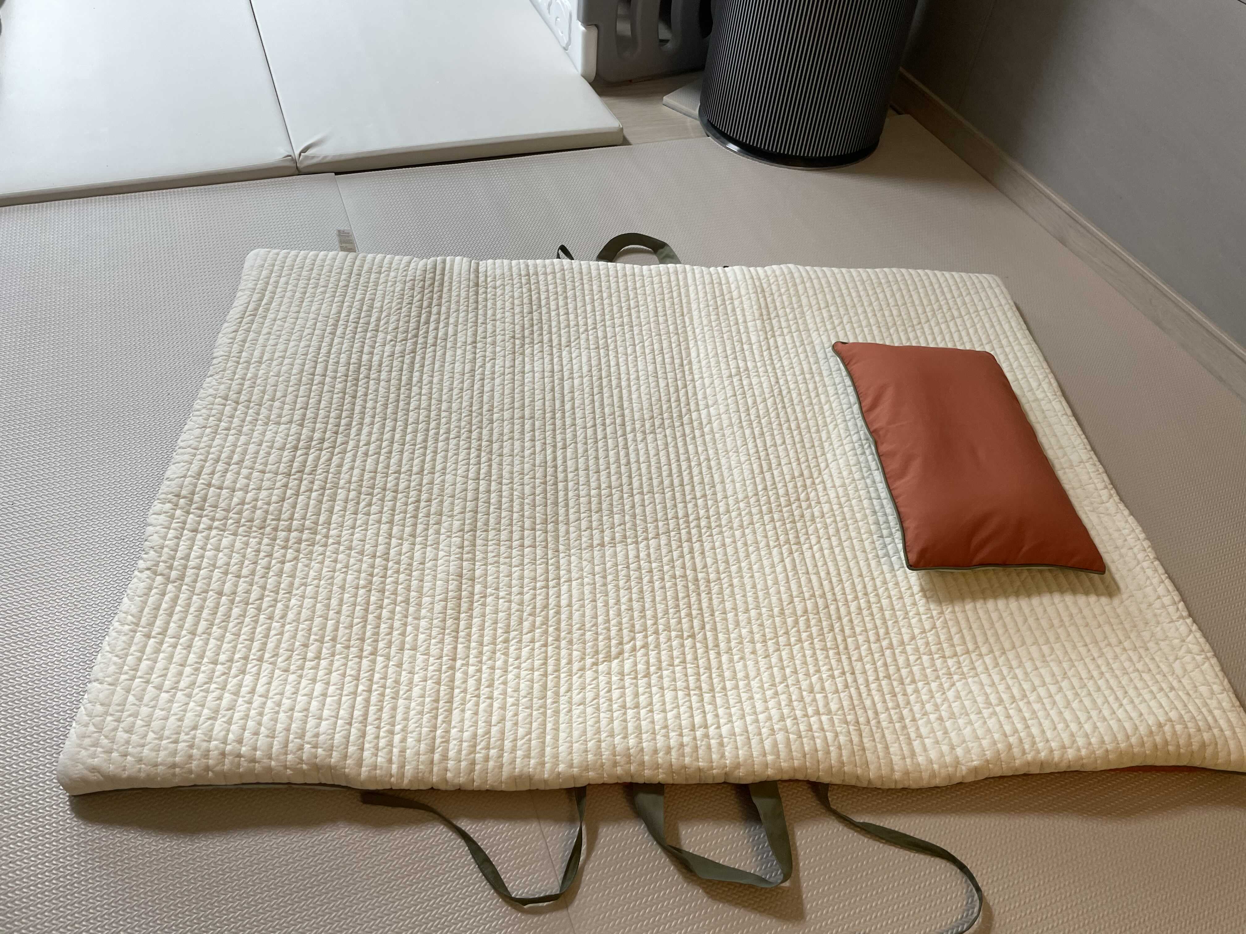 낮잠패드 속 베개를 넣었고, 이불도 접은 모습입니다.