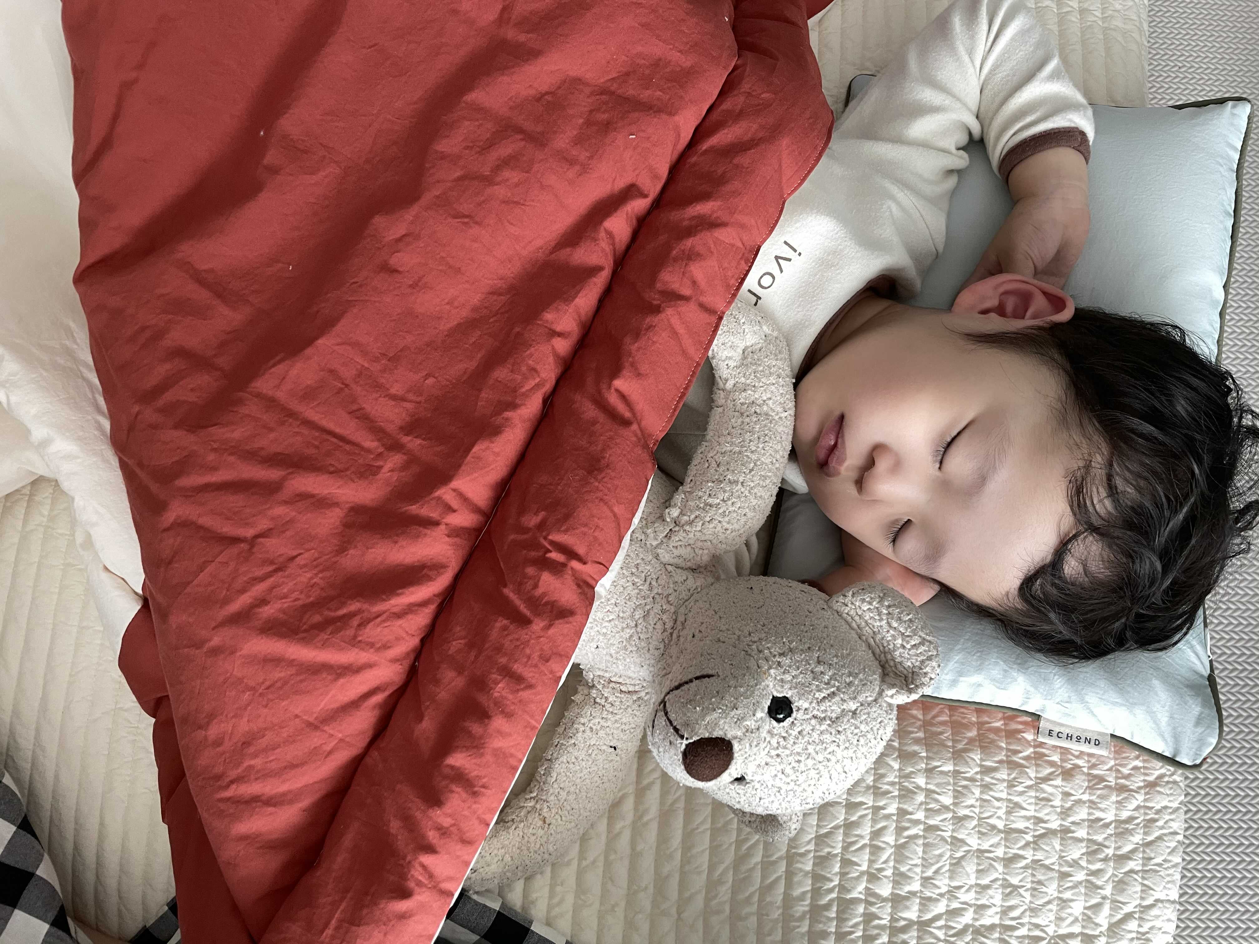 애착인형을 안겨주니 꼭 안고 자다가 옆으로 눕더니 던져버립니다. 기존에 사용하던 베개가 잘 때마다 찾는 애착베개 같은 존재였음에도 불구하고 낮잠 들 때 따로 찾지 않는 모습이 너무 신기하고 다행이었습니다.