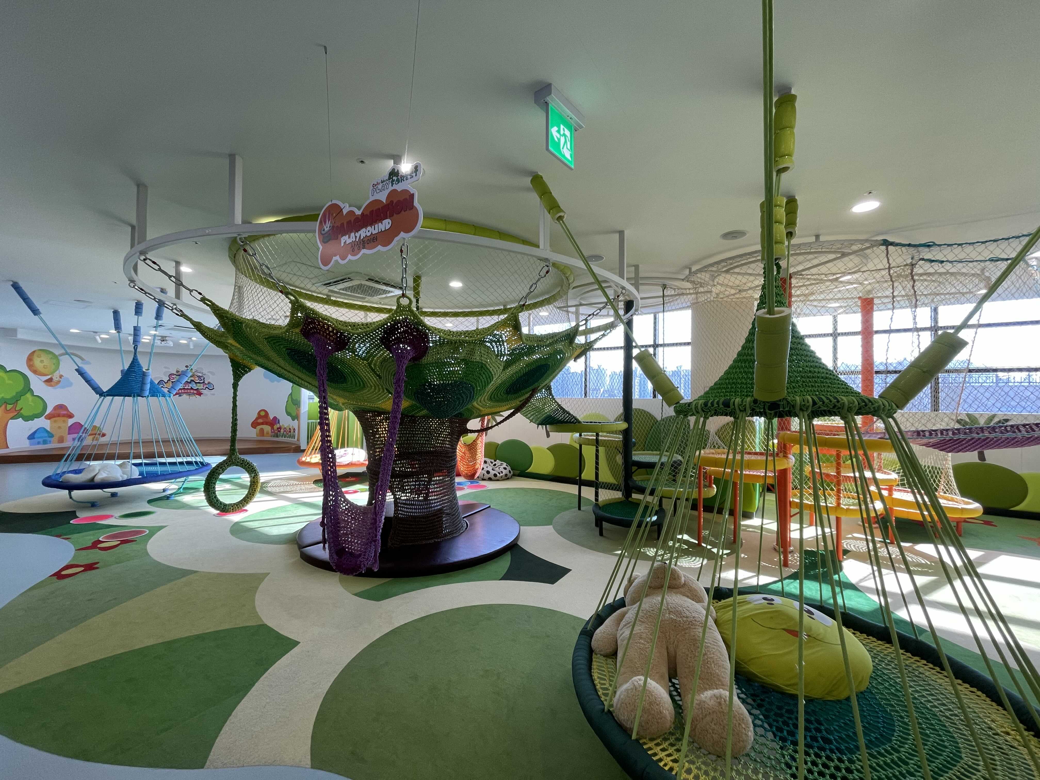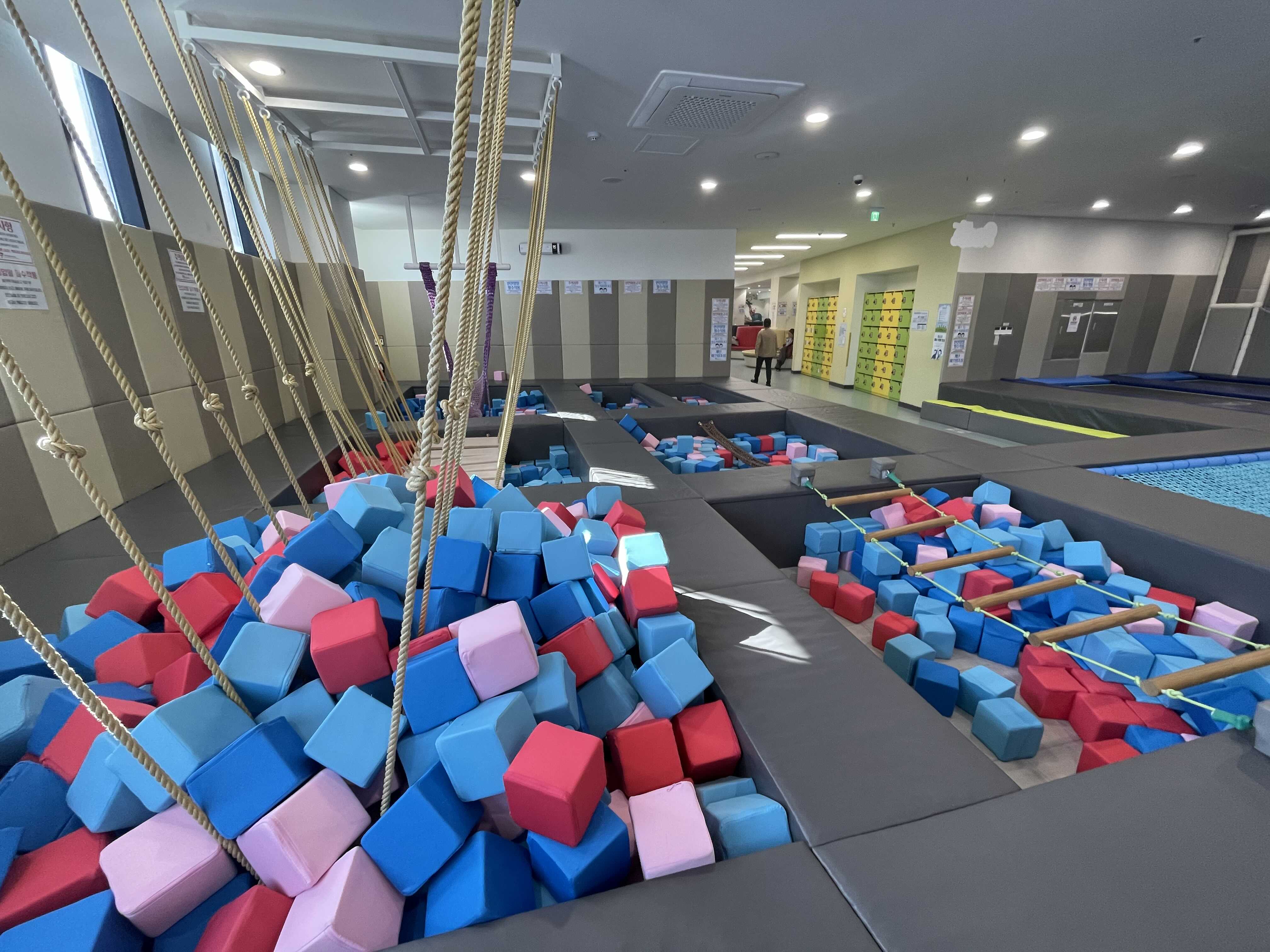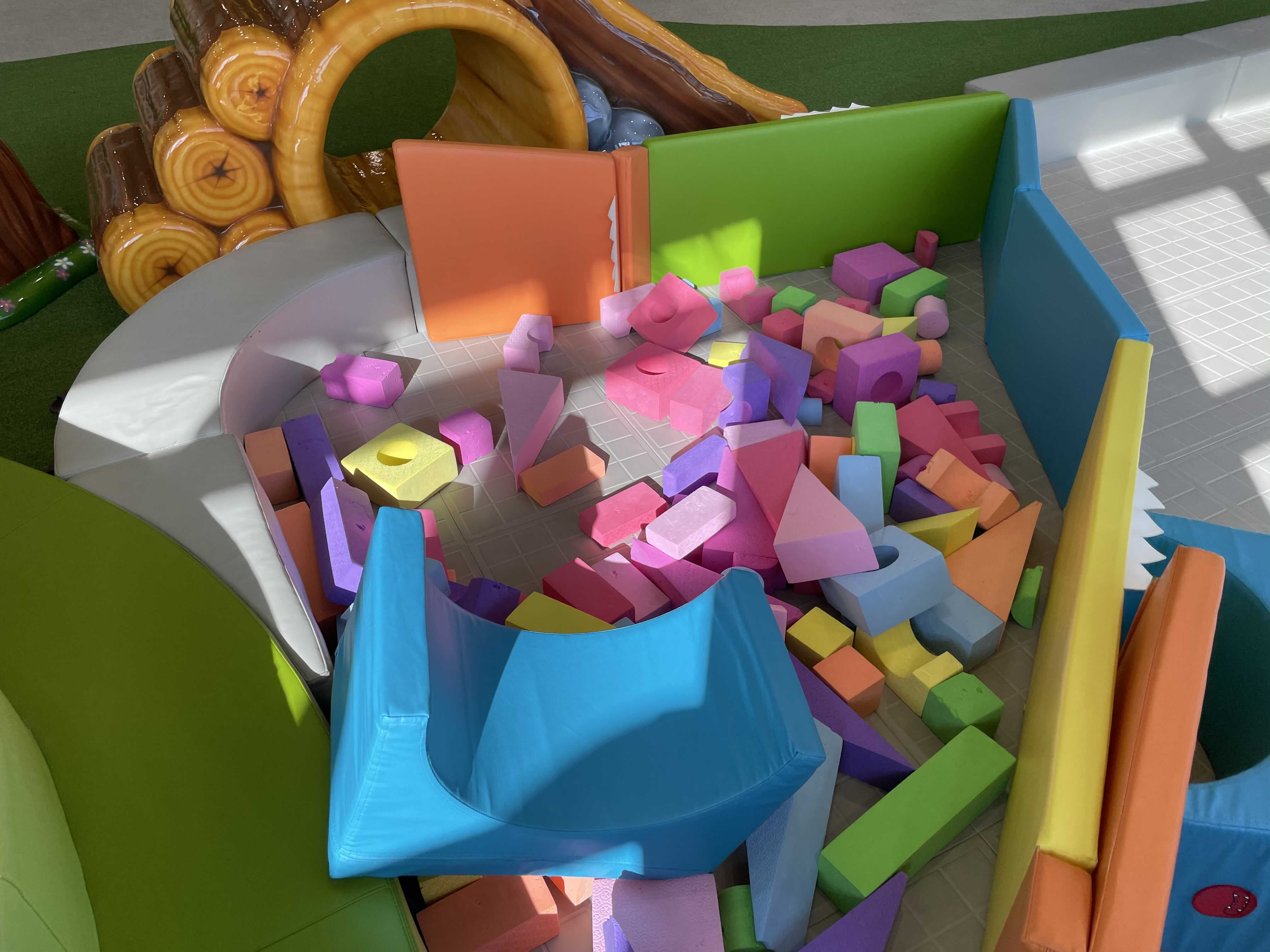 트램펄린 옆쪽에는 중앙에 나무들과 네모블록들이 가득한 놀이공간을 볼 수 있습니다.
