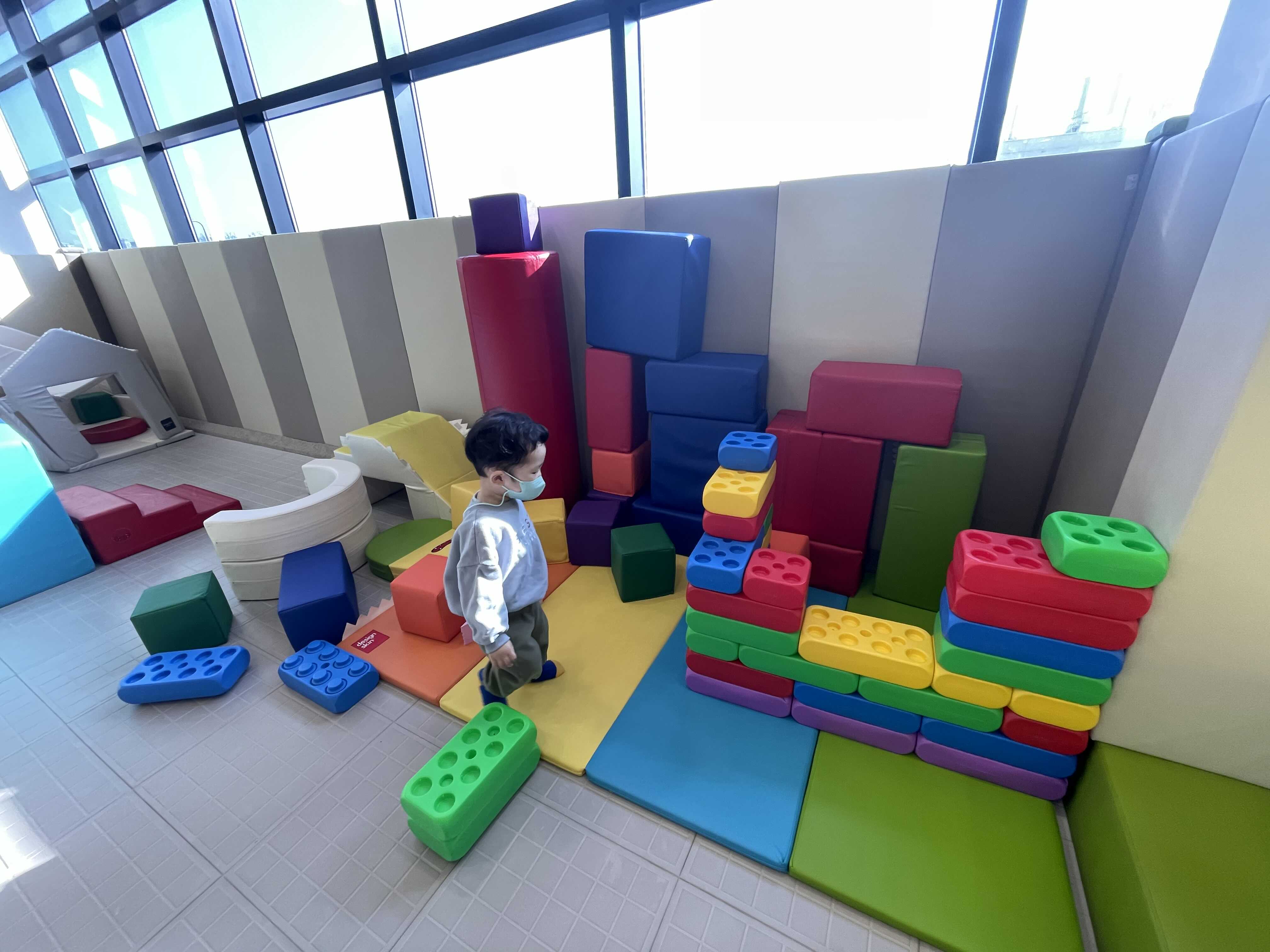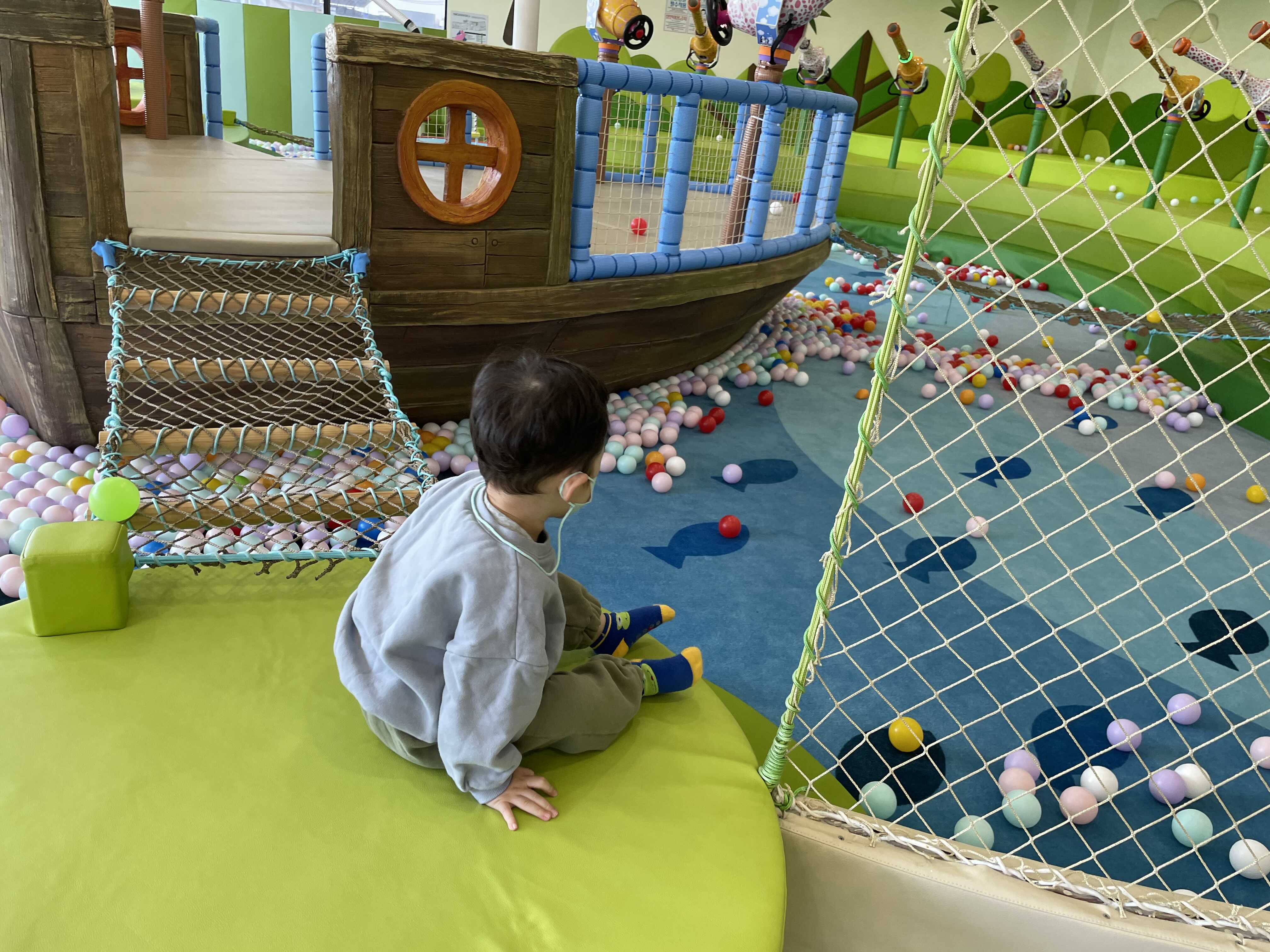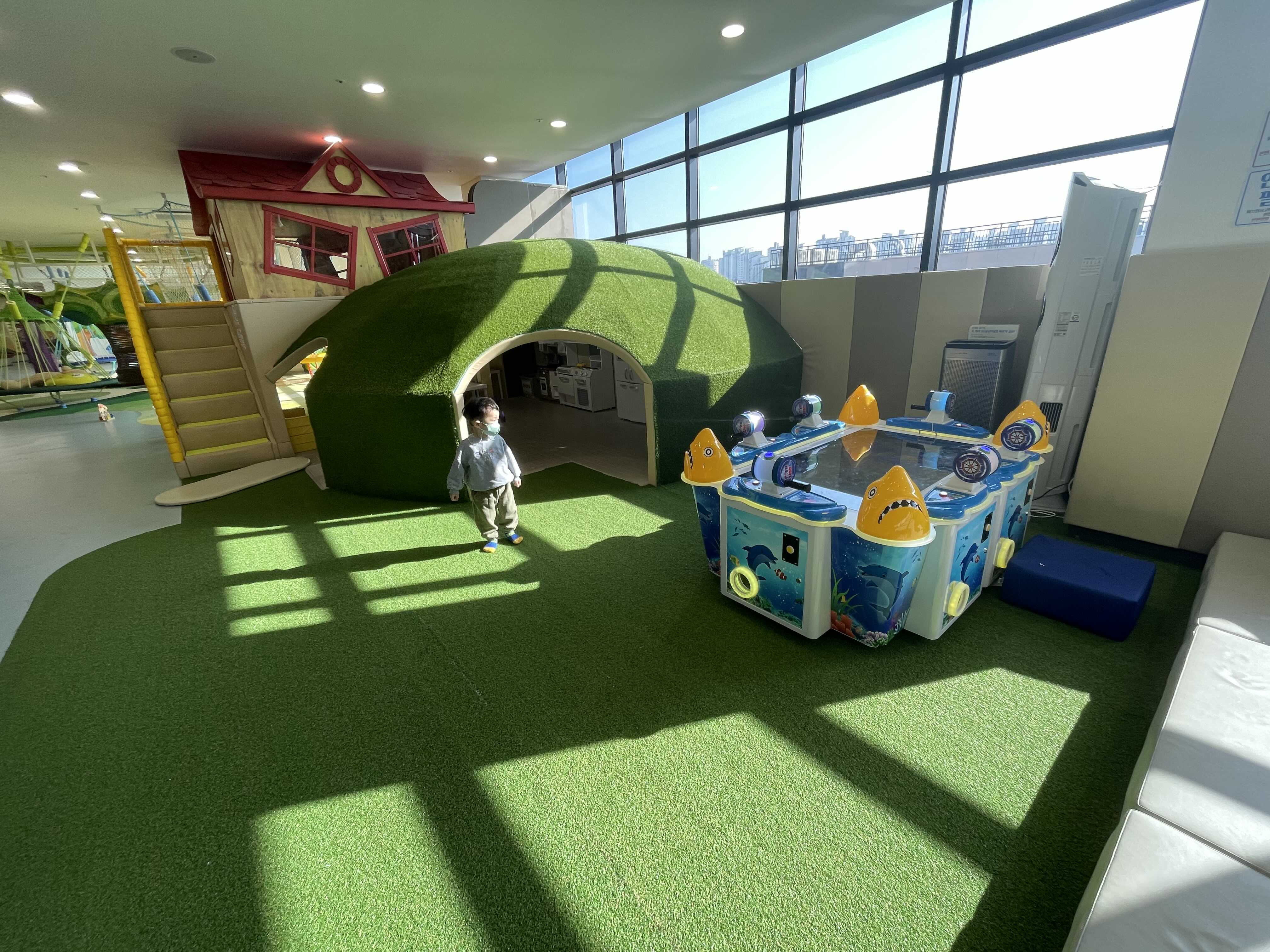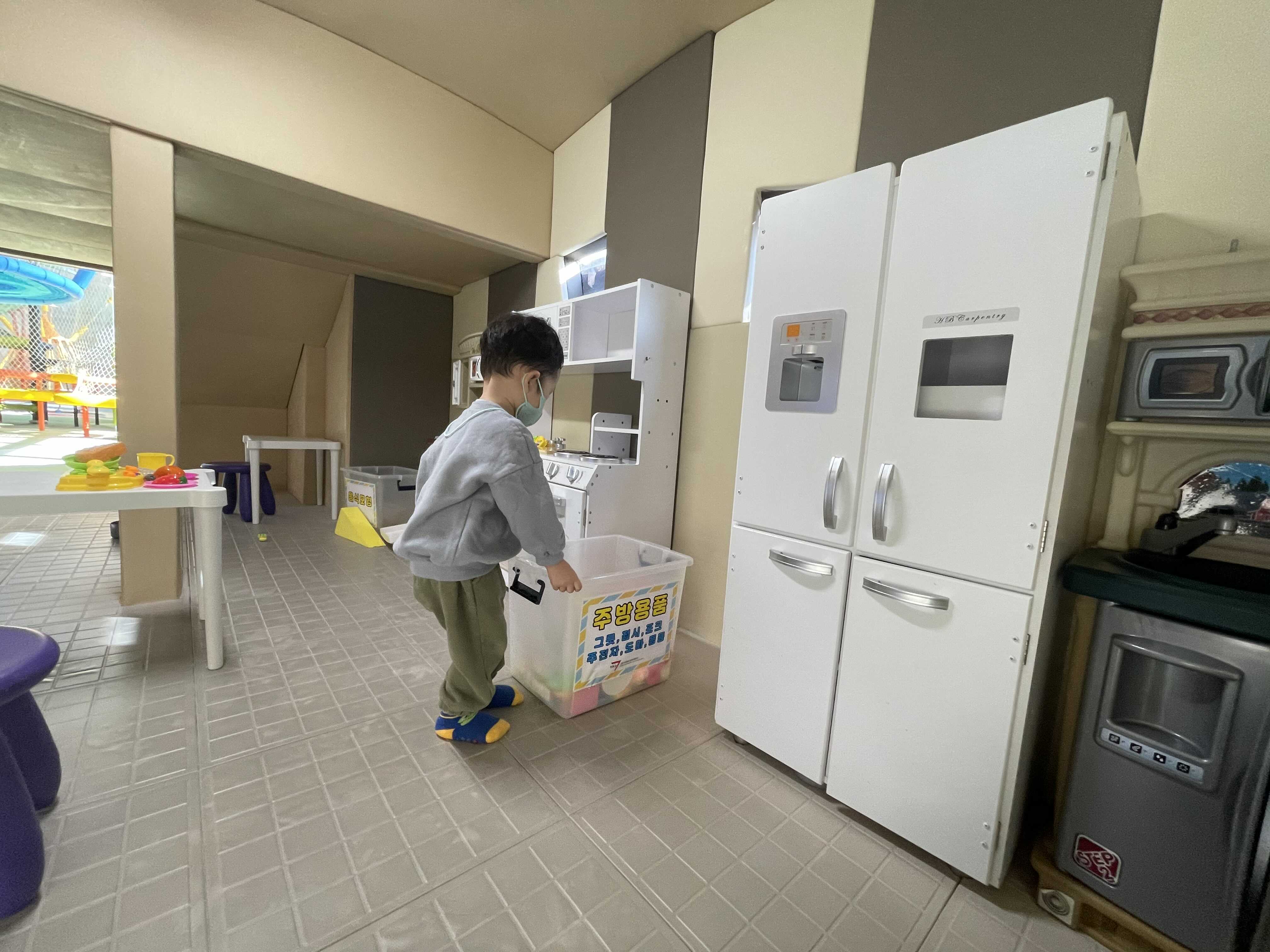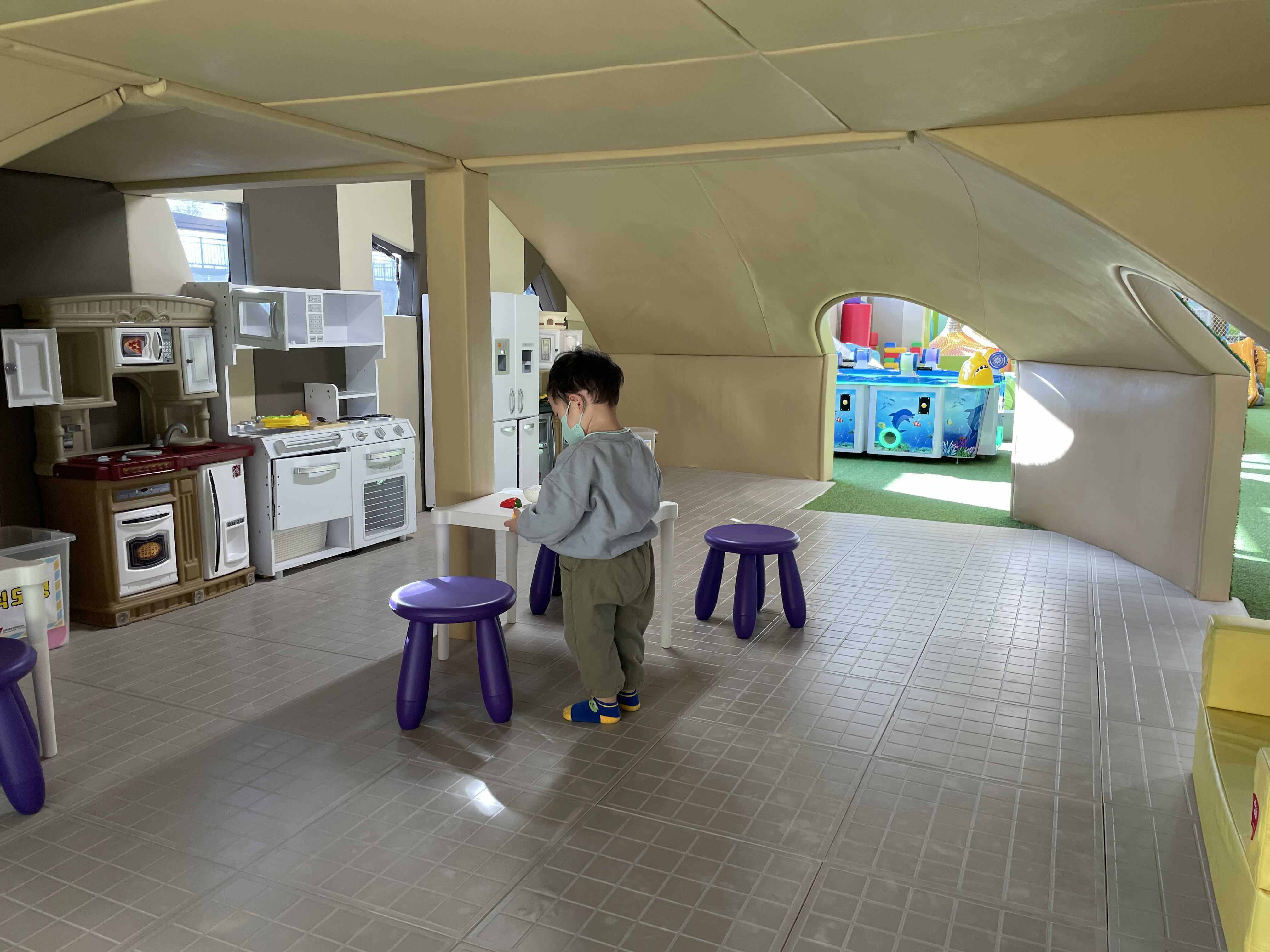 들어가자마자 정면에 아이들이 올라탈수있는 시설물이 보이고 오른편 왼편으로 갈 수 있는데, 규모가 생각보다 커서 놀랍니다. 아이는 22개월이라 아직 대근육 놀이보다는 소근육 놀잇감을 더 선호하는 편에서 들어가자마자 돔으로 생긴 곳 아래에 마련되어 있는 주방놀이부터 시작합니다.