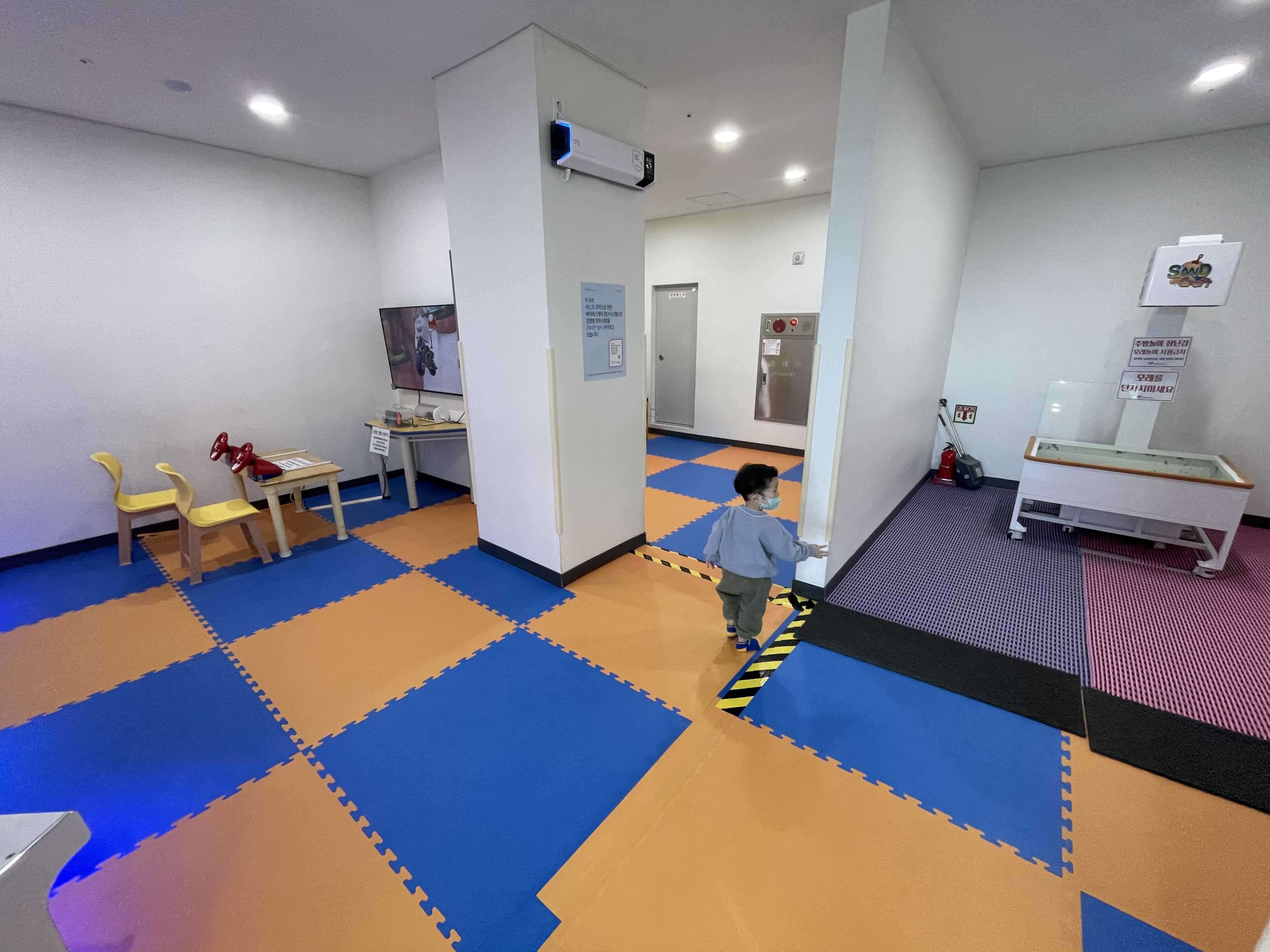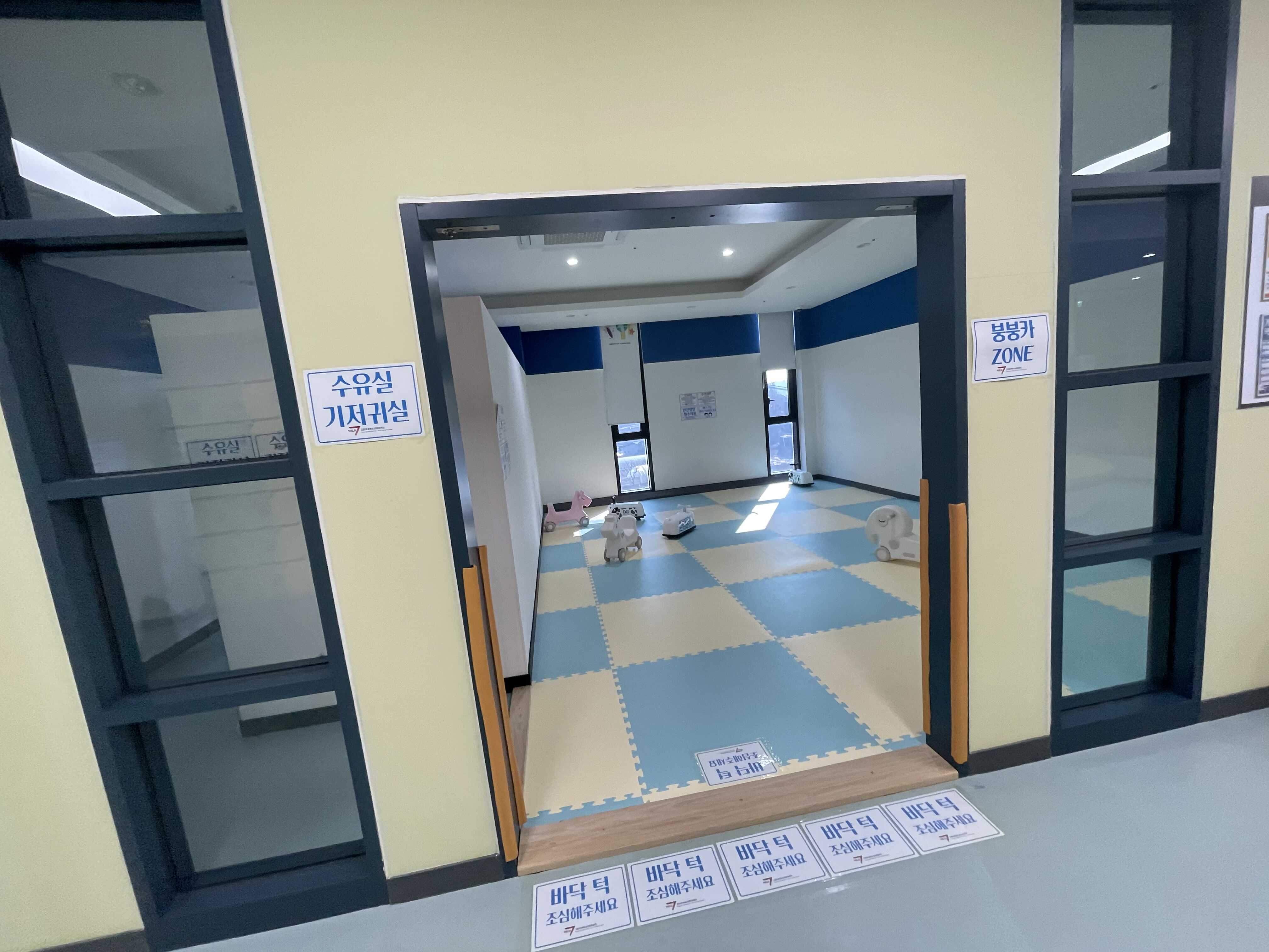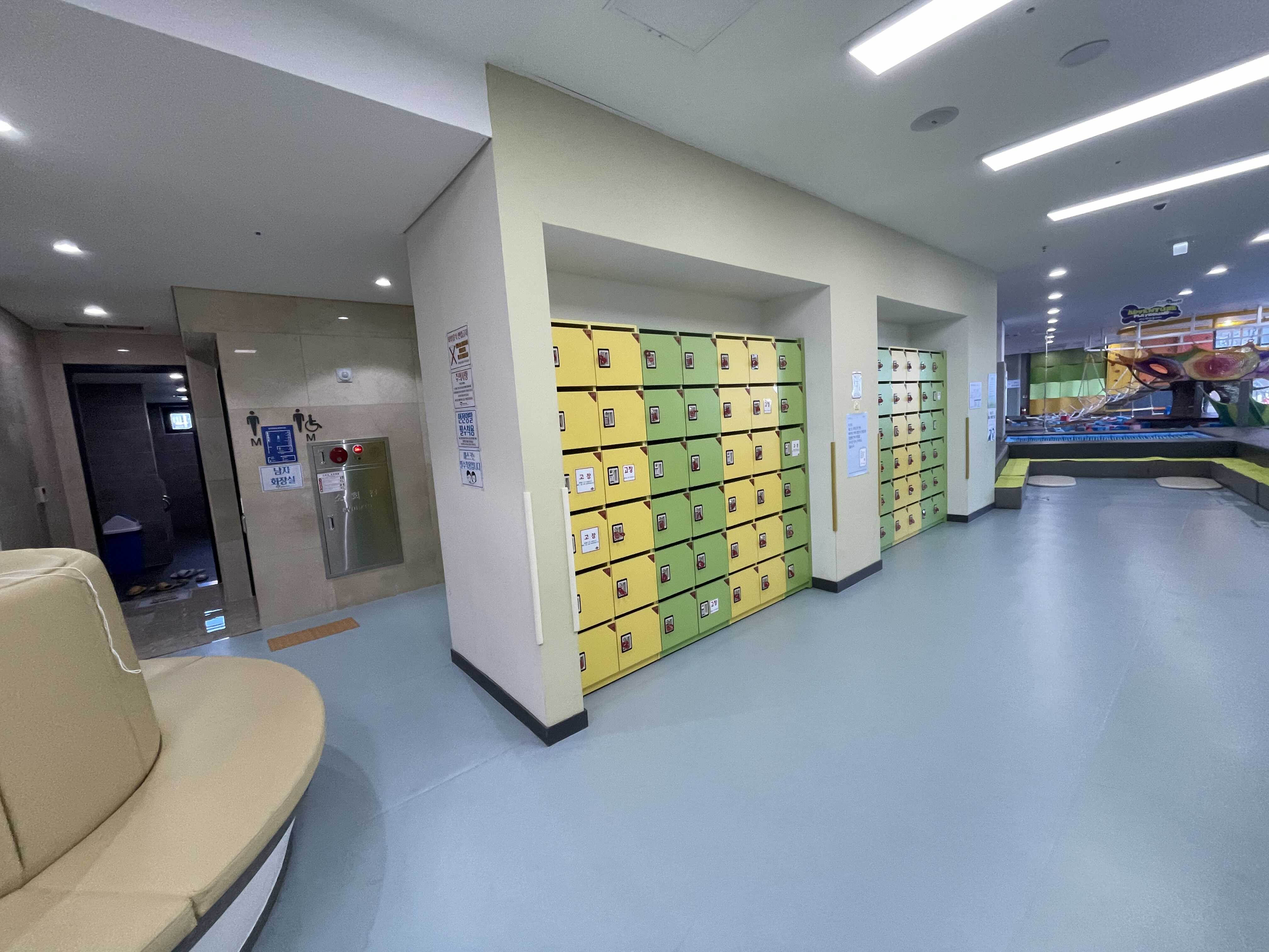 붕붕카존 왼쪽에 수유실이 위치해 있고, 화장실 앞편에는 짐을 보관할 수 있는 라커룸이 준비되어 있습니다.