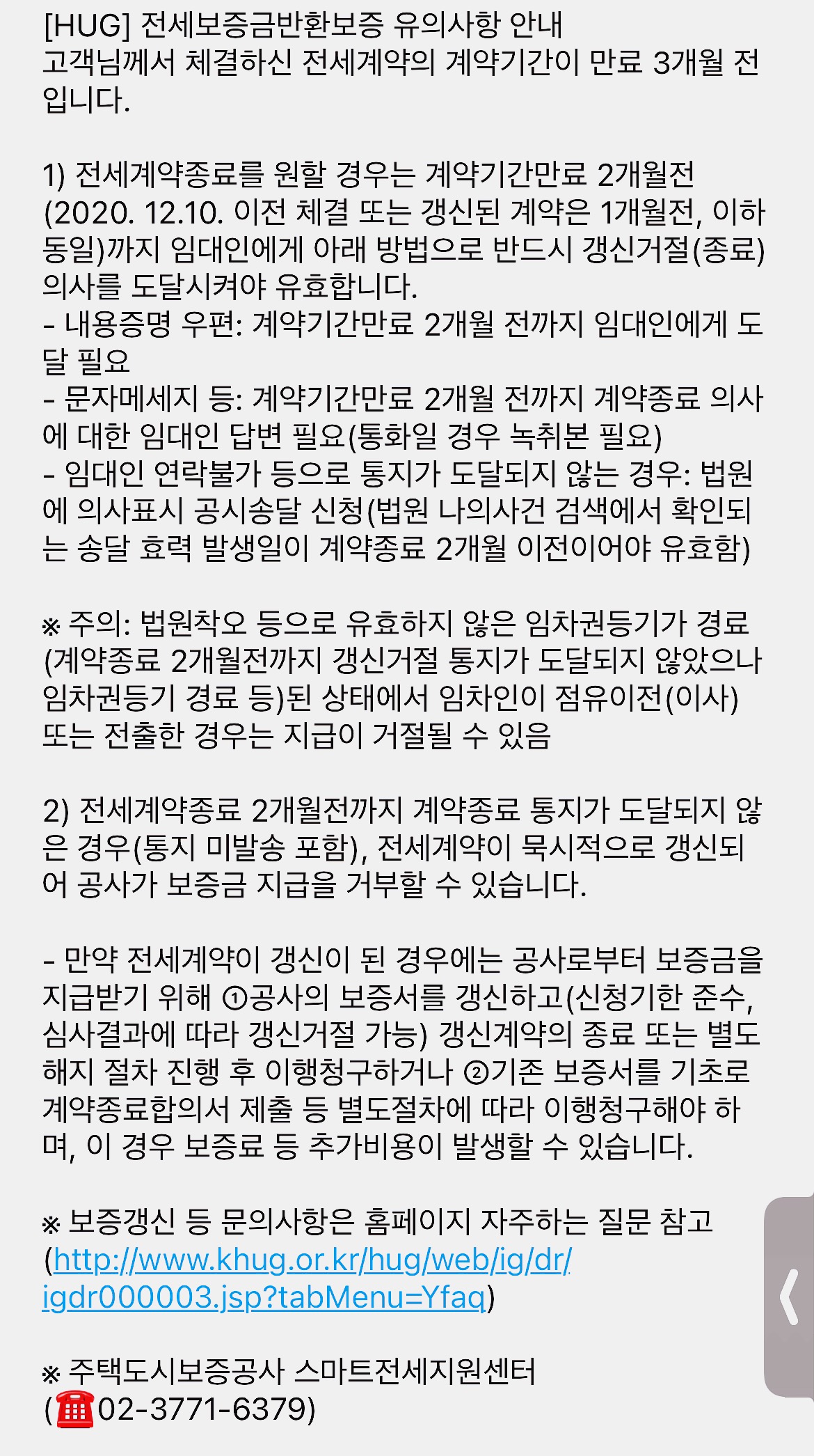 (허그 전세보증보험에서 2년 전세계약 만기 3개월 전 알림 문자를 받았습니다.)